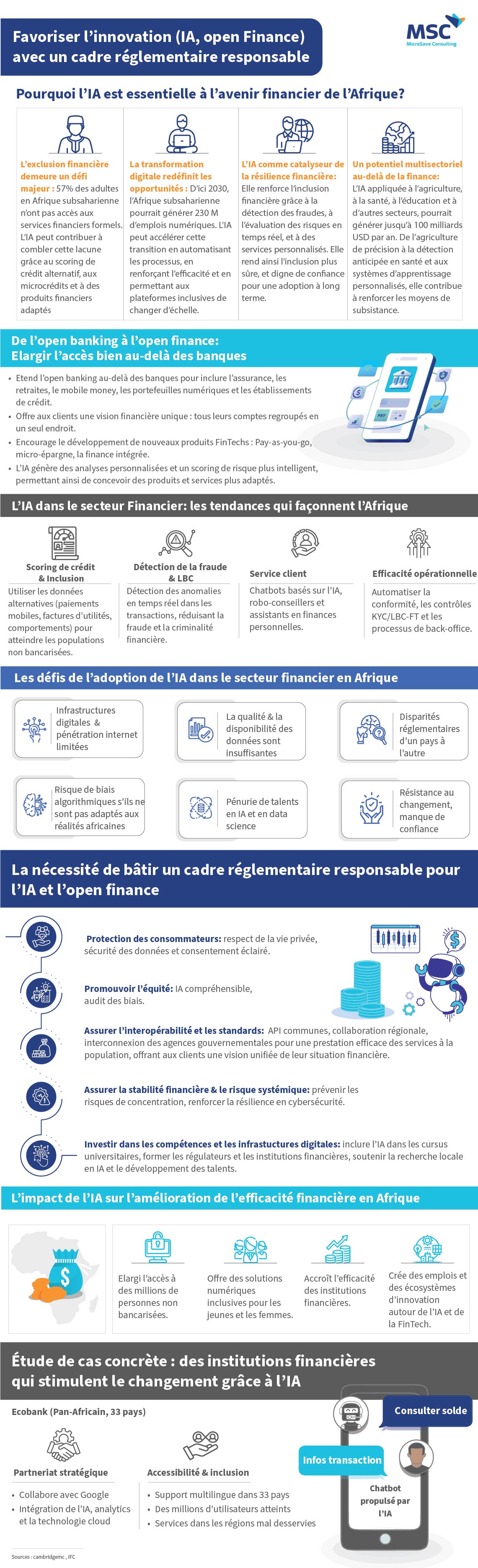 L’IA transforme déjà le secteur : elle étend l’open banking à des services financiers plus larges, permet le scoring de crédit, facilite la détection des fraudes et améliore la relation client. Pourtant, des défis demeurent : infrastructures numériques insuffisantes, écosystèmes de données fragiles, incohérences réglementaires et pénurie de compétences.